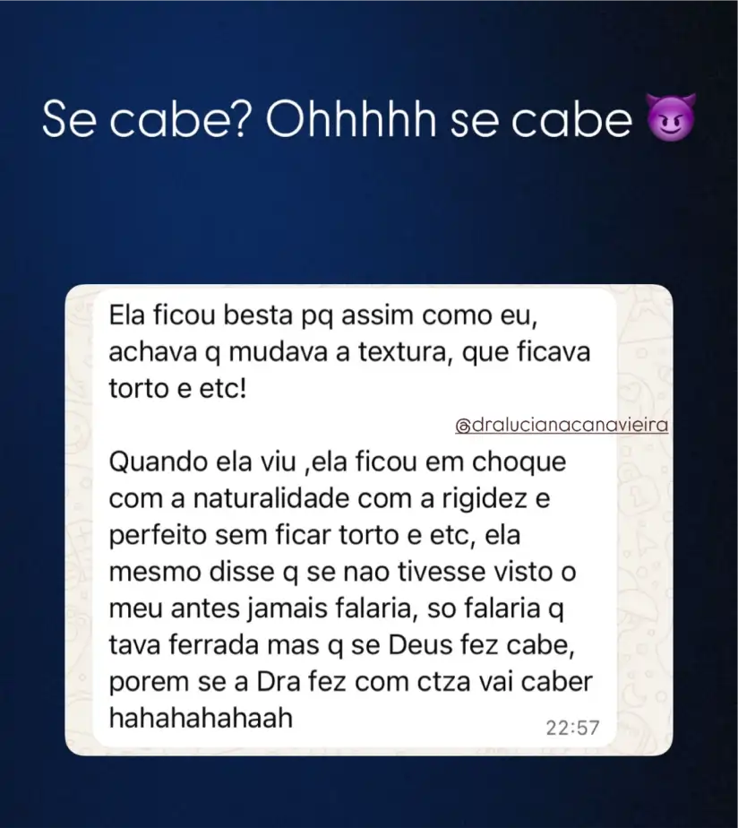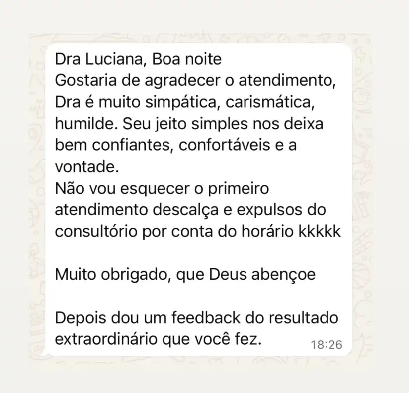 EXCELENTE Com base em 41 avaliações Publicado em Rondon VieiraTrustindex verifica se a fonte original da avaliação é Google. ÓtimaPublicado em Fábio SousaTrustindex verifica se a fonte original da avaliação é Google. O atendimento ao inicial, o processo e o atendimento após o processo são fantásticos. As clínicas onde atende em São Paulo são bem equipadas. O material utilizado são de ótima procedência. Tudo é bem explicado ao paciente e a decisão de seguir cabe a ele. Acredito que o fator mais importante na decisão de seguir com o procedimento, foi a segurança passada pela Dra. Luciana e certeza que nós veremos mais vezes. Sobre o resultado, garanto que vale a pena.Publicado em Ednaldo BarbosaTrustindex verifica se a fonte original da avaliação é Google. Gostaria de agradecer a DRA LUCIANA CANAVIEIRA pelo procedimento que ela fez em mim Uma super profissional . E eu já tinha pesquisado uns três profissionais Mas nenhum me passou Tanta segurança e confiança quanto ela . Confesso que estava com um pouco de medo Mas logo ela me fez sentir à vontade E me esclareceu todas as dúvidas sobre o procedimento até que foi realizado EU ESTOU MEGA FELIZ COM O RESULTADO Muito obrigado Dra LUCIANA CANAVIEIRAPublicado em Paulo RicardoTrustindex verifica se a fonte original da avaliação é Google. A verdadeira missão de um médico é tratar o ser humano, e não apenas a doença, também no bem estar, expectativa de algo melhor que faça você sentir feliz. Quero parabenizar dr a, Luciana pelo seu trabalho e pelo profissionalismo muito obrigada ❤️❤️❤️❤️❤️❤️❤️Publicado em Rennan SouzaTrustindex verifica se a fonte original da avaliação é Google. Excelência desde o primeiro atendimento até pós procedimentos. A Dra Luciana é uma profissional incrível: carisma, atenção, respeito, segurança, competência e capacidade, te deixa MUITO bem informado e sem dúvidas…tudo high level. Super indico!Publicado em Mauro MattosTrustindex verifica se a fonte original da avaliação é Google. Profissional exemplar e resultados incríveis e expressivos de mais! Obrigado Dra Luciana CanavieiroPublicado em gui wes gwTrustindex verifica se a fonte original da avaliação é Google. Primeiramente a Drª Luciana se mostrou muito profissional, ética e acolhedora. Confesso que estava nervoso com o meu atendimento, porém ela me fez sentir seguro e a vontade. Fui muito bem tratado, e ela me esclarecer todas as dúvidas. Deixo aqui minha gratidão e o reconhecimento pela profissional e pelo trabalho que ela faz, melhor o quanto ela elevou minha auto estima. OBRIGADA DRª LUCIANA CANAVIEIRA.
